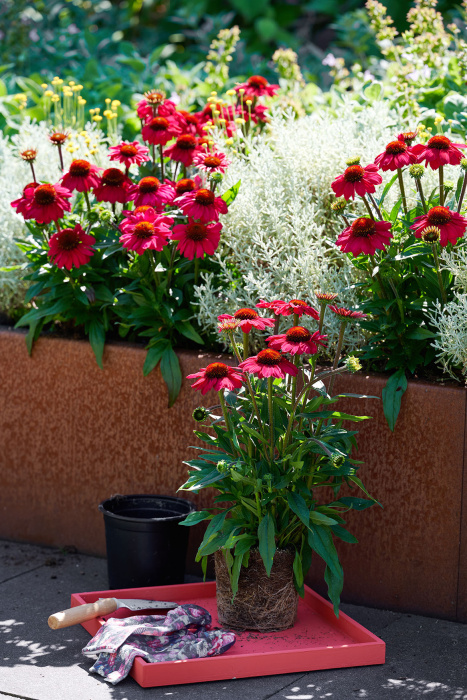 Echinacea MOOODZ® Flirty is een compacte schoonheid die indruk maakt met haar sterke rood-roze kleur en perfect ronde bloemblaadjes. Deze vaste plant combineert rijke bloei met een uitstekende vertakking, waardoor ze ideaal is voor potten van 15–17 cm en een echte topper voor tuin en terras. Flirty is niet alleen mooi, maar ook efficiënt: perfect voor retail en eenvoudig te verzorgen.